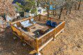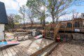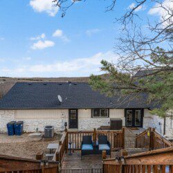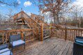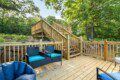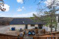 Expansive windows fill the home with natural light, while a stunning three-level deck offers breathtaking hilltop views. The yard features large rocks and steep areas, adding to its unique landscape. The multi-level deck is elevated on all sides, requiring stairs for access.