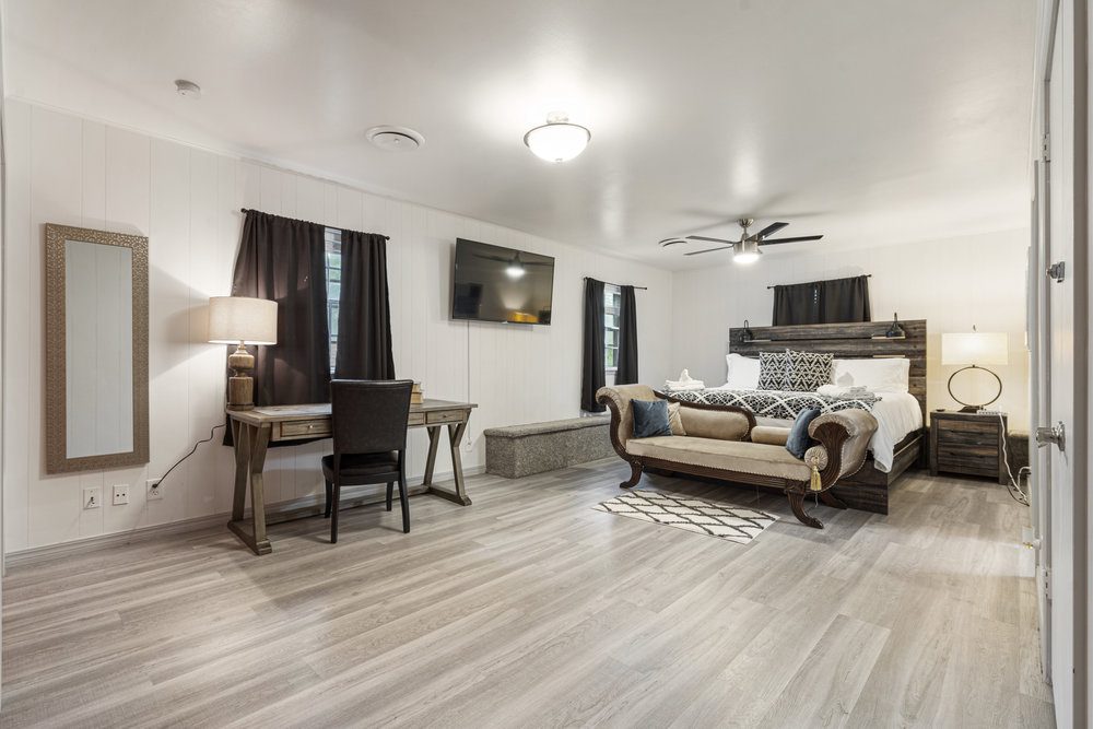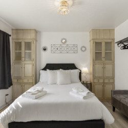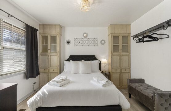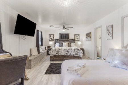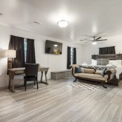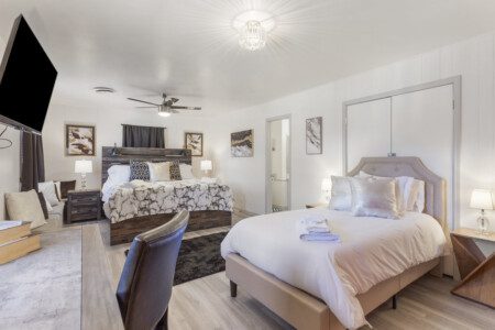 2 separate master suites each with King beds, electric fireplaces, one w/work space
