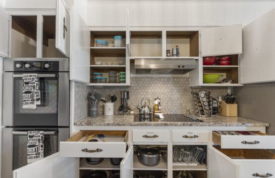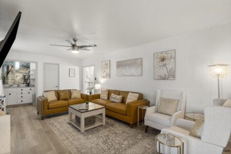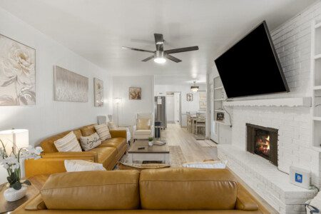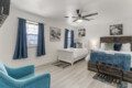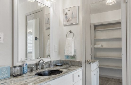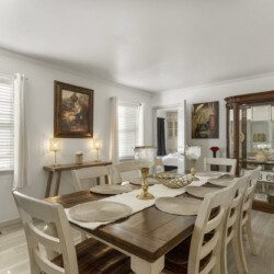 You can enjoy casual meals in the kitchen or a more formal meal in the dining area. There is a relaxing living room with a 75″ TV and a wet bar. The living room opens out to the outdoor patio area where there is a 5 burner grill and a nice sized backyard with patio furniture you can relax on.