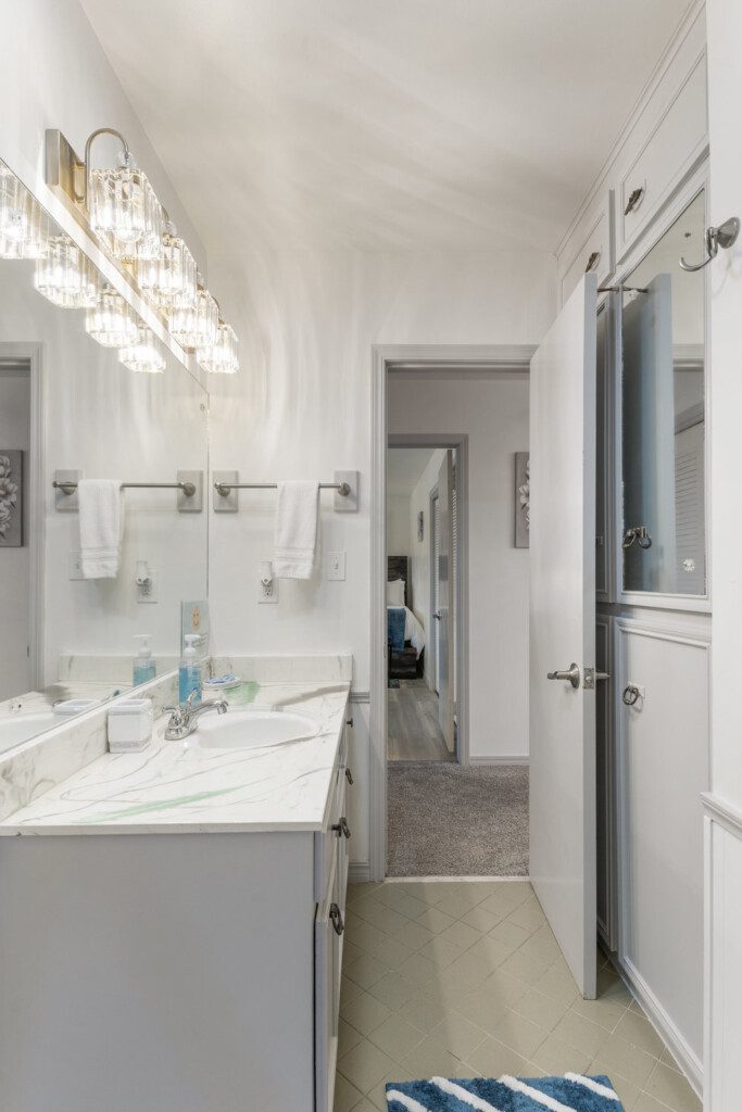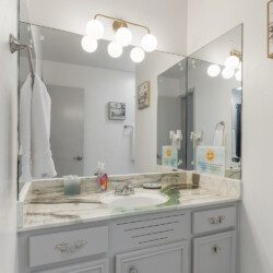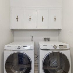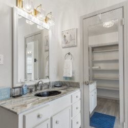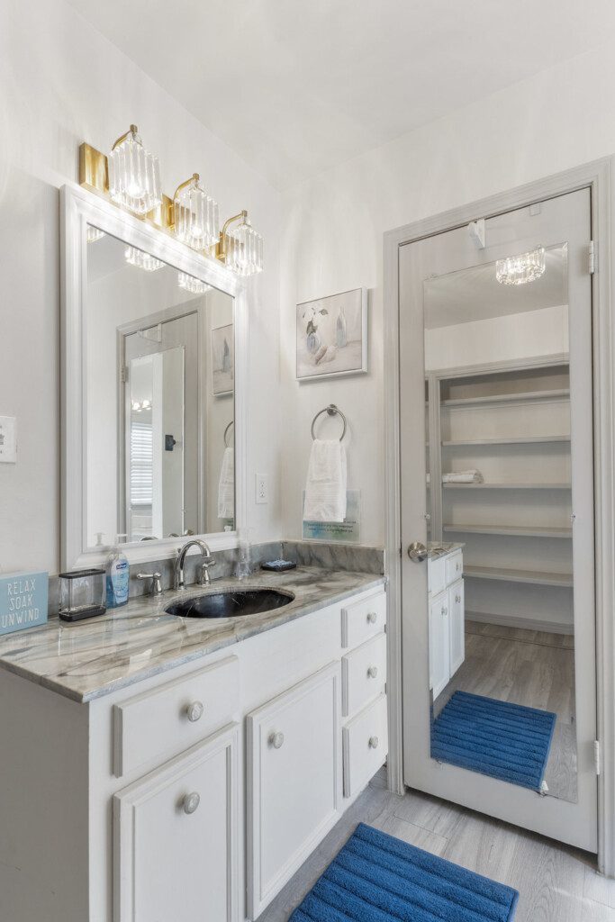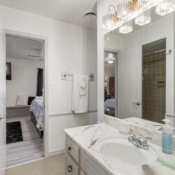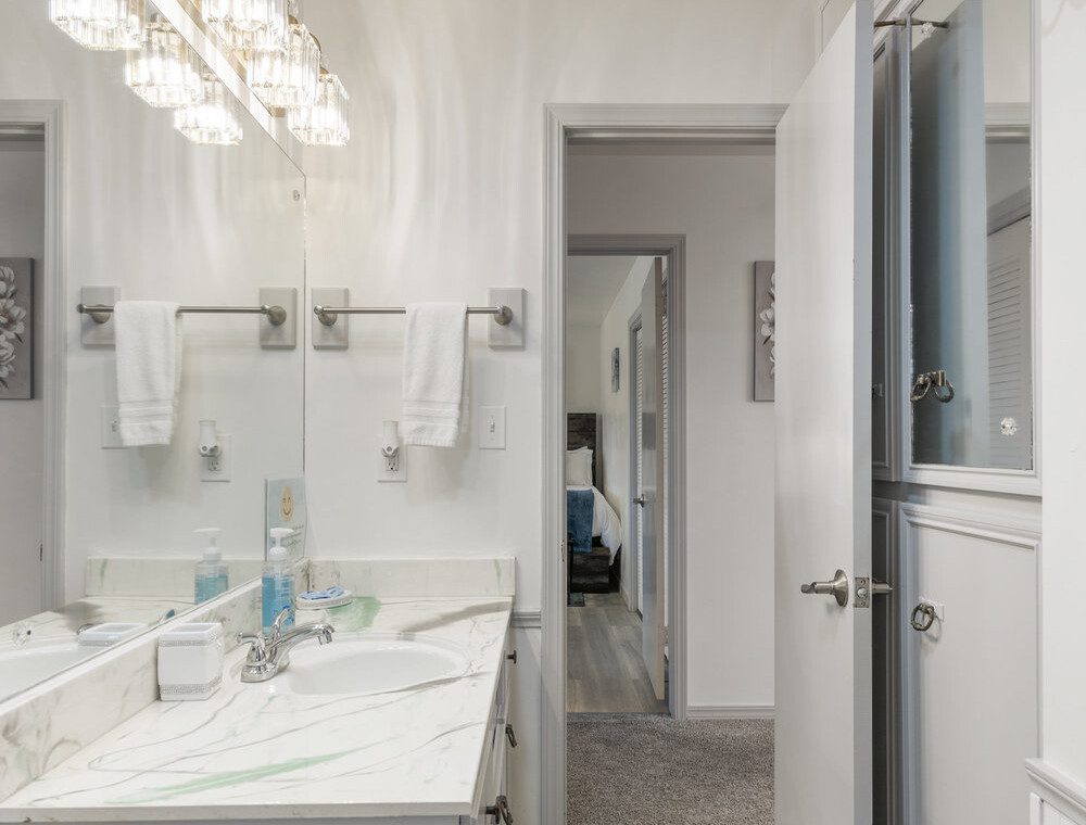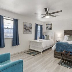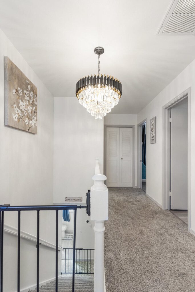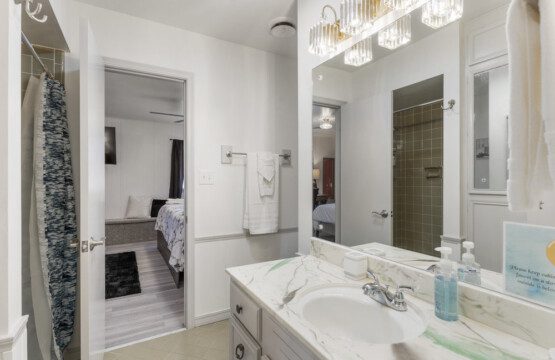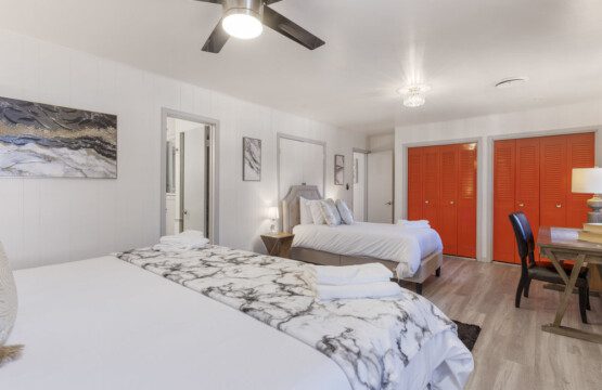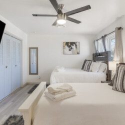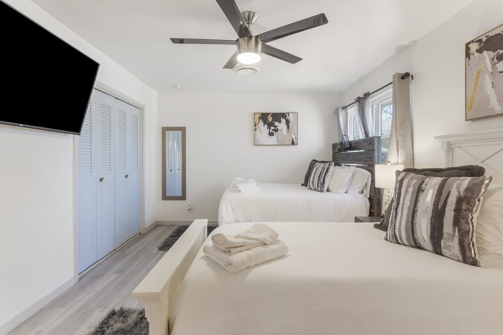 There are 5 bedrooms (2 downstairs and 3 upstairs) and 3.5 bathrooms. There is a master bedroom and a full bedroom downstairs and a master bedroom which has a workspace upstairs. There are also two more bedrooms upstairs for a total of three bedroom upstairs and two downstairs. All the bedrooms have 55″ TVs and Netflix, ESPN+, and Disney+